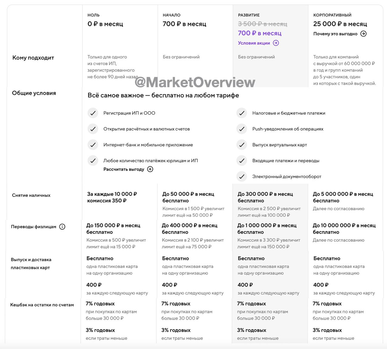 - тариф Развитие - 3500 руб/мес. Для новых клиентов Точка предлагает льготные условия обслуживания в первые три месяца - 700 руб/мес;