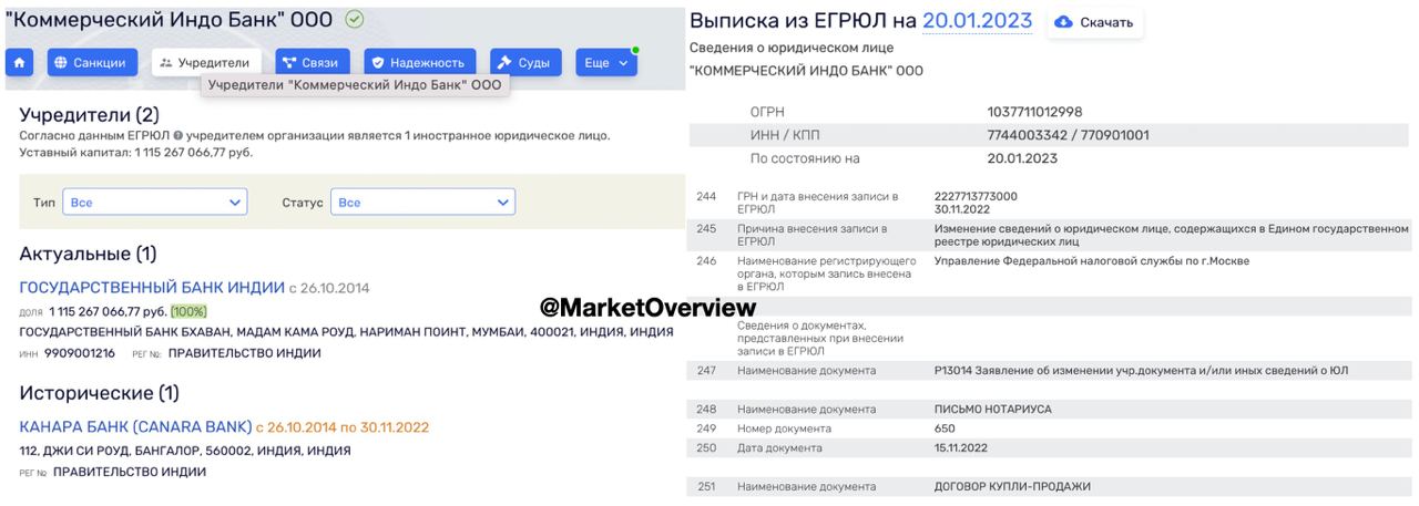 Сделку начали согласовывать еще в ноябре 2022 года, но судя по выписке ЕГРЮЛ договор купли-продажи был подписан 15.11.2022, согласно которого Canara Bank полностью вышел из капитала российского банка, Государственный Банк Индии увеличил долю с 60% до 100%.