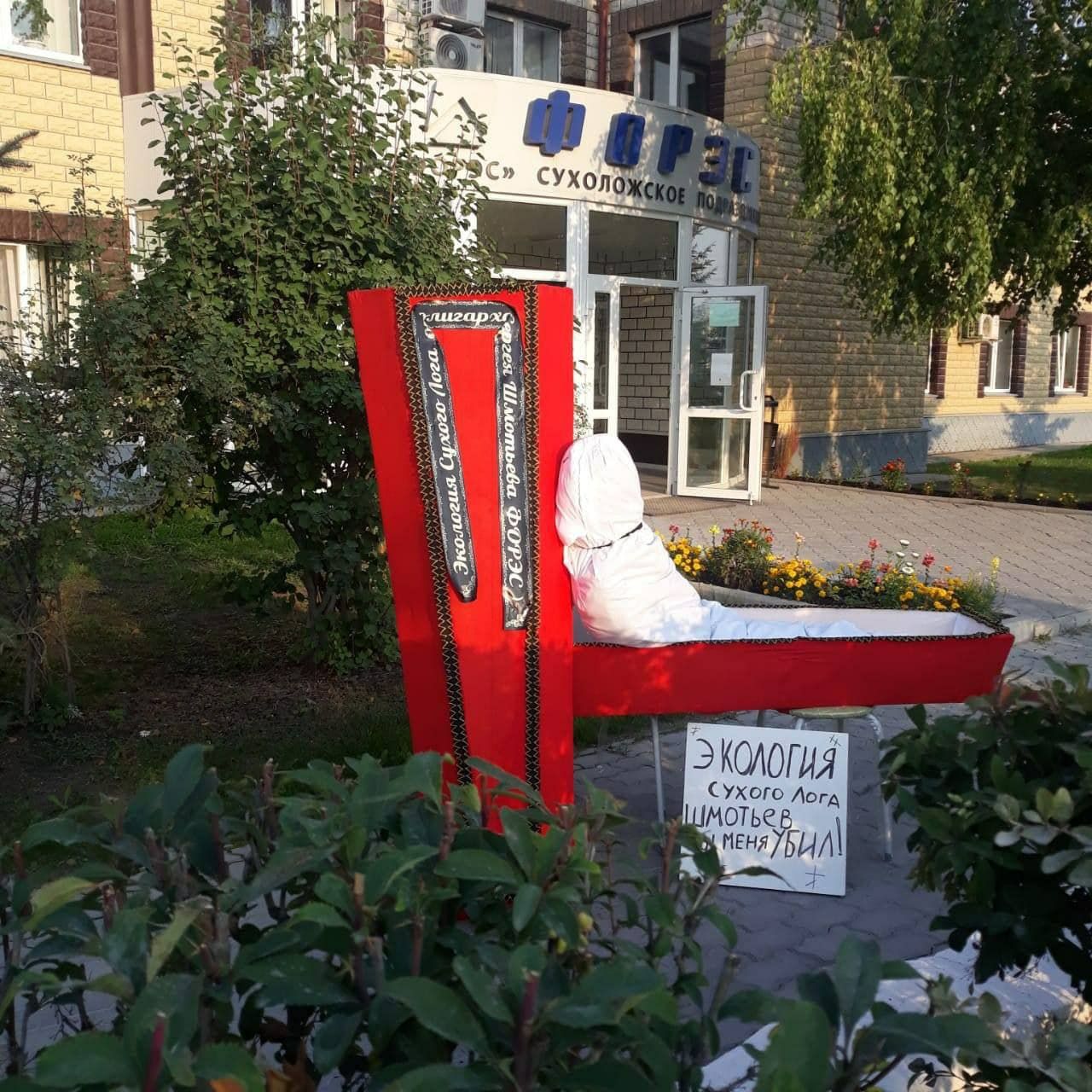 Похоже, жители Сухого Лога решили, что экология в их городе мертва. Они установили гроб с соответствующей надписью прямо у проходной Староцементного завода, который принадлежит группе компаний "ФОРЭС", возглавляемой господином Шмотьевым.