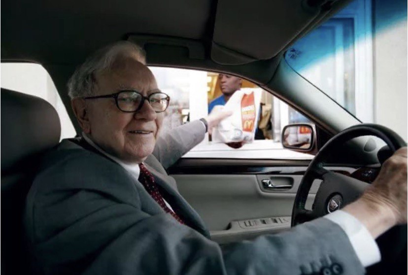 Уоррен Баффет живет в 5 минутах езды от офиса и уже 54 года он проделывает этот путь самостоятельно на машине. По дороге он заезжает позавтракать в Макдоналдс. Если он чувствует себя не слишком процветающим, он берет себе завтрак за $2,61 (2 сосиски и колу), если дела явно идут в гору - за $3,17 (бекон, яйца и сырный бисквит), а если ситуация неопределенная - за $2,95.