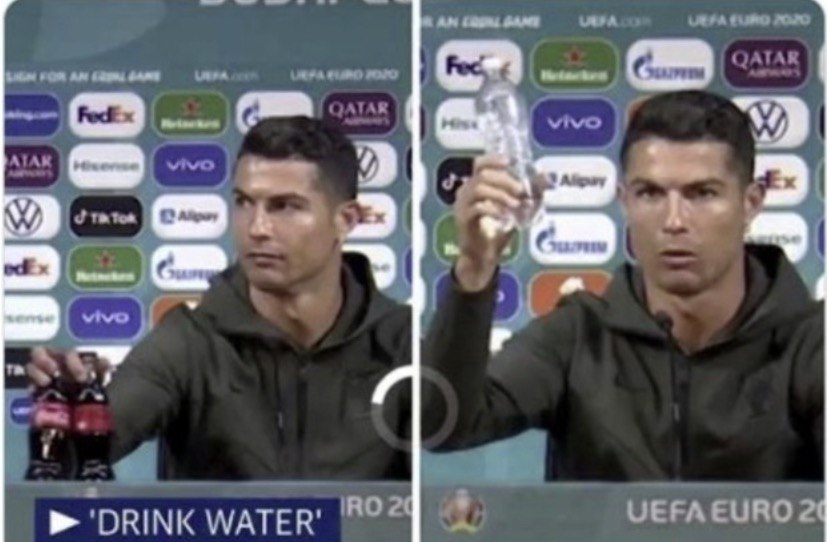 Так Криштиану Роналду на пресс-конференции ЕВРО-2020 (2021) убрал со стола пару бутылок Coca-Cola, призывая пить простую воду.