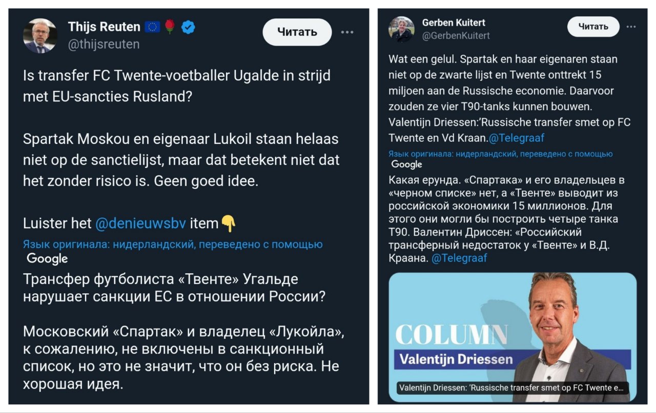 И ведь он не первый, и на мой взгляд, не самый «громкий» или «яркий» представитель этого «движения». Например, недавно сожаление о том, что «Спартак» не находится в санкционном списке высказал депутат Европарламента. А один из нидерландских журналистов начал всерьез пересчитывать этот трансфер в танках Т90, которые Россия бы могла сделать на эти деньги 🤦♂️