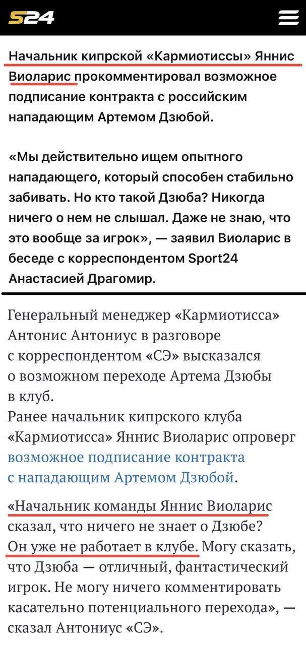ЧТД! Кипрский клуб «Кармиотисс» даже сделал заявление в ответ на слова якобы «начальника команды», настолько они были удивлены факту появления слов о «незнании» такого «фантастического футболиста», как Артем Дзюба.