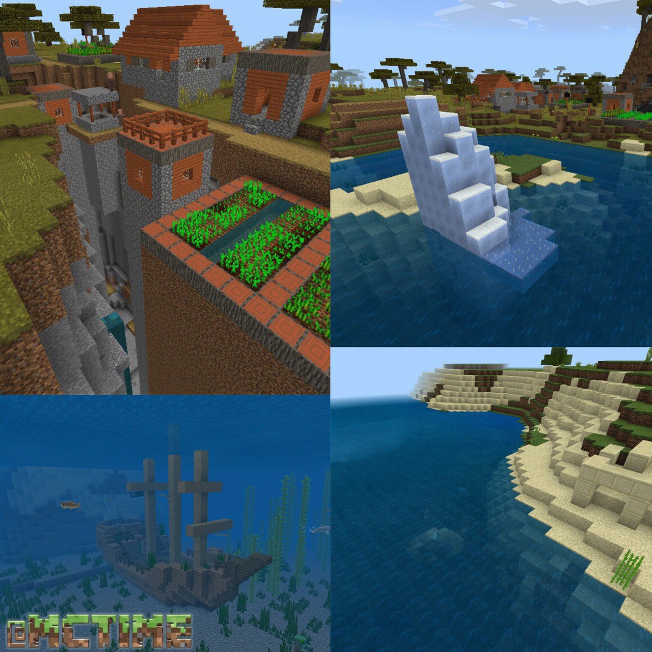 Questo è un seed molto particolare, spawnerai in una semplice pianura, ma spostandoti troverai una costa con una rovina sottomarina fuori dall'acqua e andando più oltre verso la Savana troverai un magnifico villaggio in un cayon e un secondo villaggio in cui sulla costa si trova un unico iceberg dovuto ad un errore di generazione.