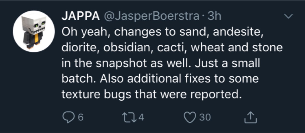Nel nuovo snapshot 18w44a sono cambiate delle texture in base alle segnalazioni della community. Ci sono stati cambiamenti alla sabbia, all’andesite, alla diorite, all’ossidiana, al cactus, al grano (quello piantato) e alla pietra ed è stata aggiunta la nuova texture del pesce palla che negli scorsi snapshot non era presente.