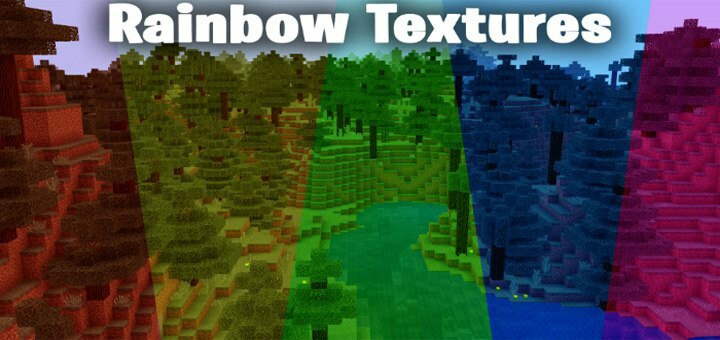 Rainbow Environments è un pacchetto di texture che rende divertente e stimolante qualsiasi mondo! Sostituisce il colore dei biomi con 5 diversi colori configurabili! Rosso, Giallo, Verde, Blu e Viola! Cambia alberi, foglie, erba e felci.