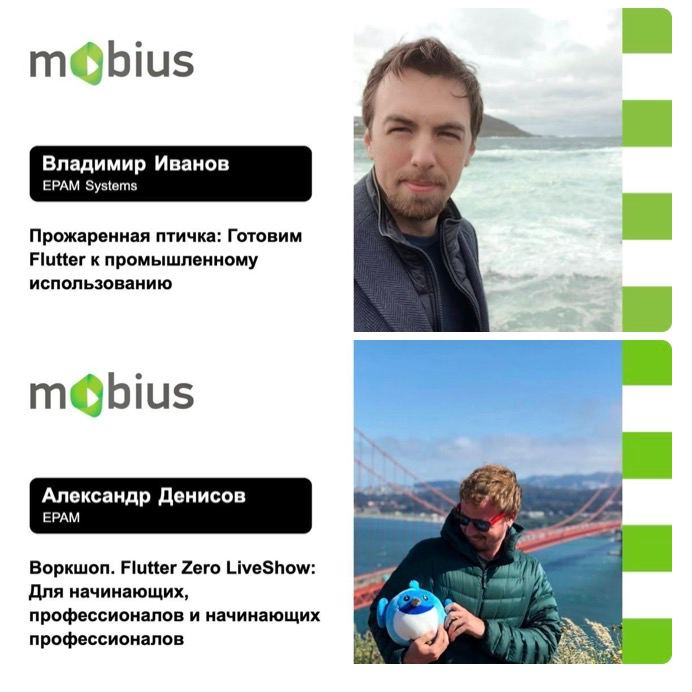 Вова выступает сегодня, с докладом “Прожаренная птичка: Готовим Flutter к промышленному использованию”, где будет рассказывать о нюансах использования фреймверка, которые не видны сразу, но могут доставить много неудобств в процессе разработки, а в субботу Александр проведет то ли воркшоп, то ли лайвшоу “Flutter Zero LiveShow: Для начинающих, профессионалов и начинающих профессионалов”, где в прямом эфире будет пилить приложение и отвечать на вопросы опытных нативных разработчиков Жени Ртищева (iOS) и Миши Емельянова (Android), но никогда не пробовавших до этого во Flutter.