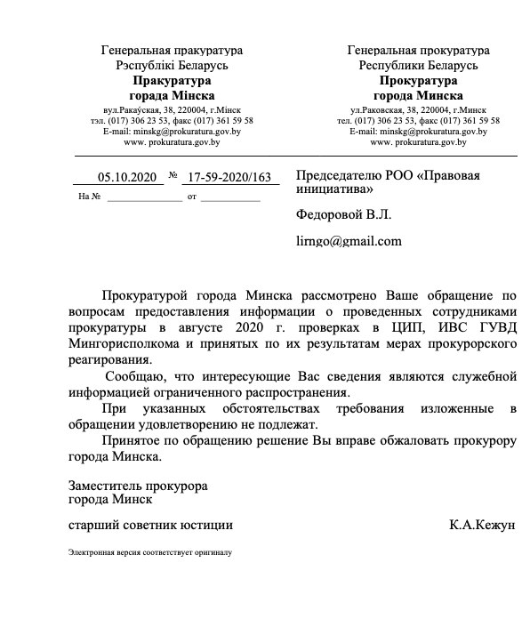 Мы хотим напомнить всем работникам минской прокуратуры, лично Казимиру Кежуну, а также его начальнику, прокурору города Минска, Олегу Лаврухину, что в соответствии с п. 1 ст. 9 закона о прокуратуре, «прокурорский работник действует гласно и открыто». Публикация общей информации о ходе расследования (количество опрошенных и привлеченных к ответственности сотрудников, перечень произведенных следственных действий и т.д.) не противоречит действующему законодательству и не является государственной тайной. А значит, прокуратура просто бездействует и занимается сокрытием особо тяжких преступлений.