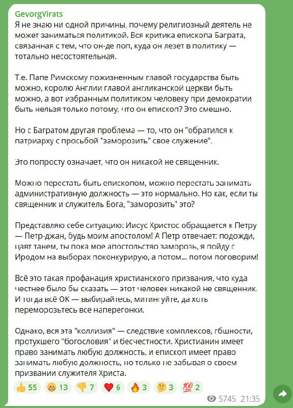 Что касается решения Србазана попросить временно приостановить его служение у католикоса Гарегина II, то это абсолютно правильное действие, которое не подлежит обсуждению. Во избежание ненужных разговоров со стороны Пашиняна и его сторонников, сложение полномочий епископа была логичным шагом. Сейчас он временно представляет собой Вазгена Галстаняна и принял предложение оппозиционного совета выдвинуть его кандидатом на пост премьер-министра.