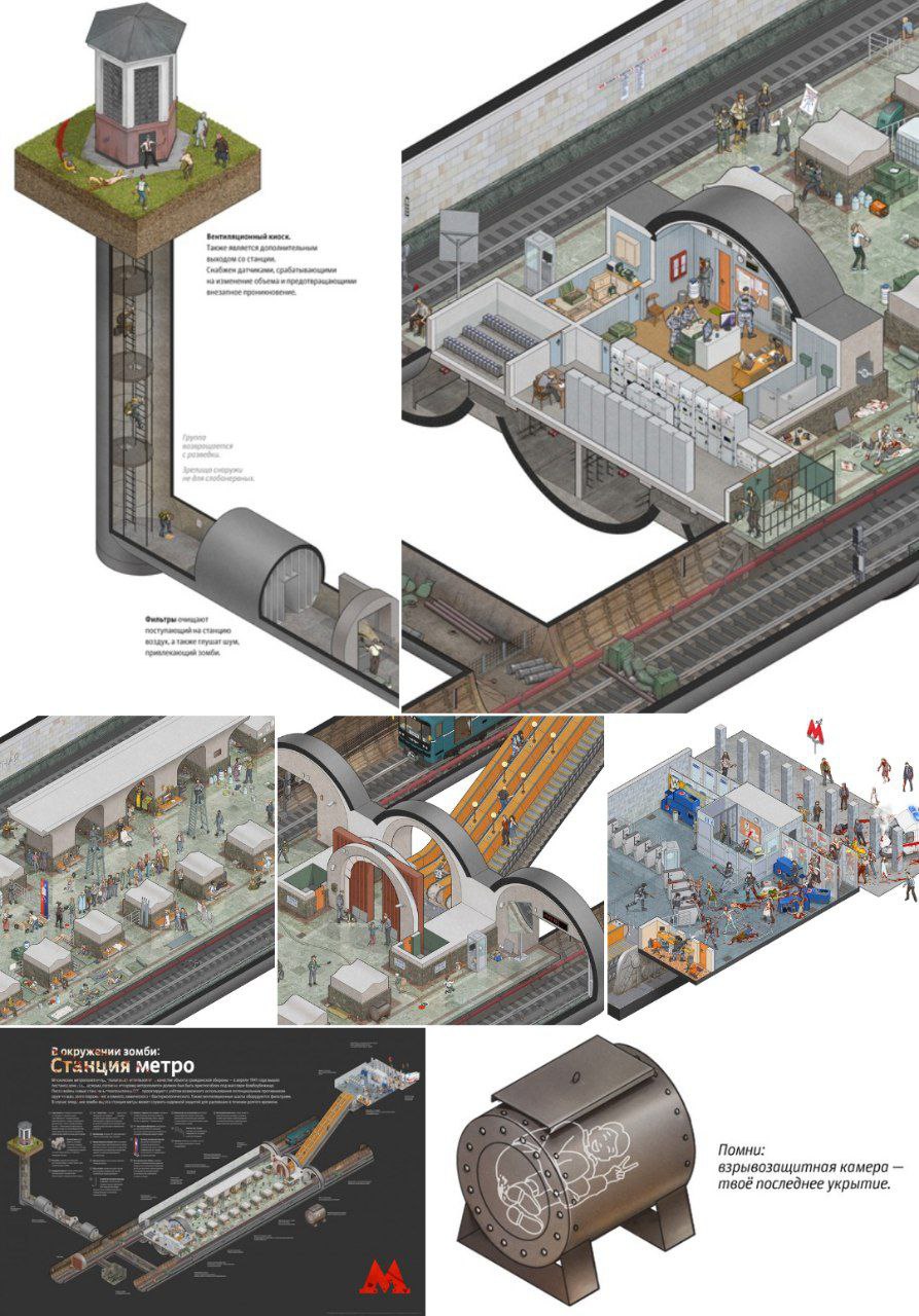Московский метрополитен предполагалось использовать в качестве объекта гражданской обороны — в 1941 году вышло постановление Совнаркома, согласно которому метро необходимо было приспособить под огромное бомбоубежище. После войны станции метрополитенов на территории СССР проектируют с учетом защиты от оружия массового поражения: атомного, химического или бактериологического. Вентиляционные шахты оборудуются фильтрами. В случае эпидемии зомби-вируса станция метро послужит надежной защитой для уцелевших в течение долгого времени.