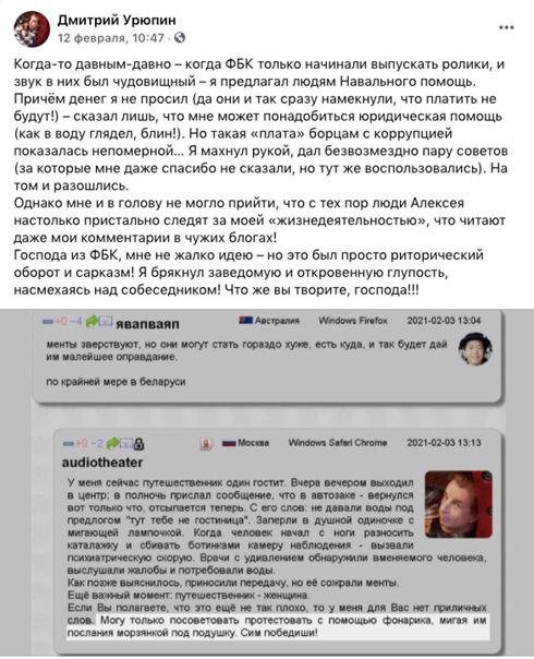 «Могу только посоветовать протестовать с помощью фонарика, мигая им послания морзянкой под подушку» — говорилось в после Урюпина. Спустя несколько дней штаб Навального объявил 14 февраля свою акцию и москвич в фейсбуке пошутил, что идею с фонариками могли взять у него.