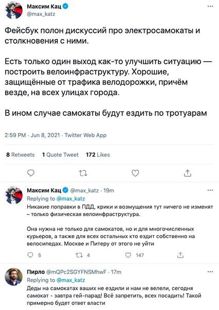 Тем временем сооснователь фонда «Городские проекты» Максим Кац предлагает более работоспособный и очевидный вариант — построить велодорожки, чтобы отделить пользователей электросамокатов от автомобилистов и пешеходов. Вы за какой вариант?