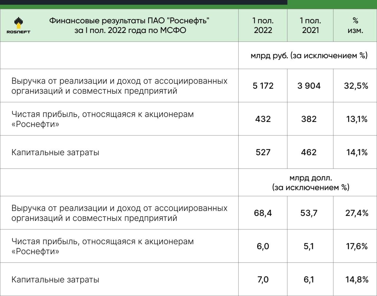 ▫️Роснефть (-2,42%). Компания обнародовала пресс-релиз финансовой отчетности по МСФО за I пол. 2022 года. Чистая прибыль за этот период составила 432 млрд руб. Для сравнения, чистая прибыль компании за II пол. 2021 года была 501 млрд руб, а за I пол. 2021 года - 382 млрд руб. Снижение прибыли по сравнению с показателями предыдущих 6 мес. вызвано как укреплением рубля, так и крупными скидками на продаваемую нефть в условиях санкционного давления коллективного Запада. Котировки от падения на высоких объемах не удержали даже заявления главного исполнительного директора Игоря Сечина: "Финансовые результаты за первое полугодие 2022 года формируют надежную основу для промежуточных дивидендов и дальнейшего роста суммарных выплат по итогам года".