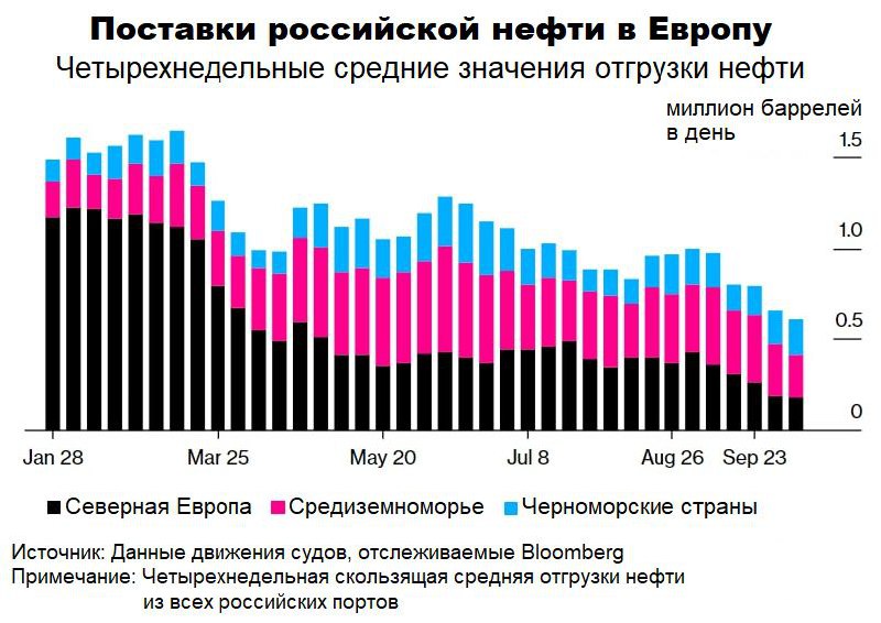 ▫️Нефть Brent снижается -1,55% ($94,6 за барр). Bloomberg сообщает, что с февраля 2022 г. продажи российской нефти в Европу по морю снизились на 60% - поставки нефти в Европу составляли в среднем 0,63 млн барр в день в течение четырех недель до 7 октября, по сравнению с 1,62 млн барр до 24 февраля.