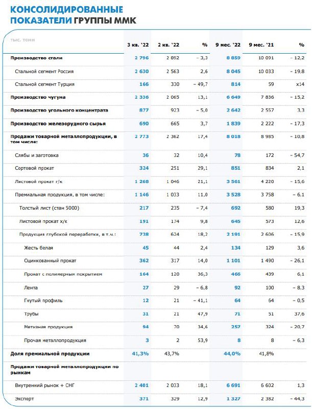 ▫️ММК (-4,13%). Компания представила операционные результаты за III кв и 9 мес 2022 года. За 9 мес текущего года зафиксировано снижение выплавки чугуна на 15,2% до 6649 тыс. тонн, а объем выплавки стали сократился на 11,7% до 8859 тыс. тонн.