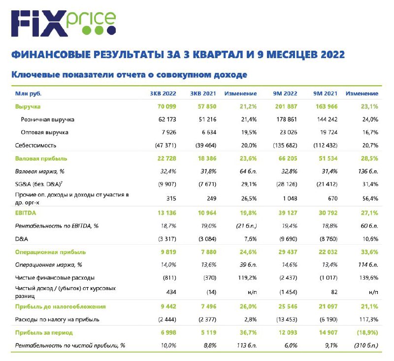 ▫️Fix Price (-0,76%). Компания отчиталась за III кв. и 9 мес. 2022 года. За 9 мес. выручка увеличилась на 21,2% г/г до 70,1 млрд руб., общее количество магазинов увеличилось на 558, EBITDA увеличилась на 27,1% до 39,1 млрд руб. Чистая прибыль за отчетный период составила 12,1 млрд руб.