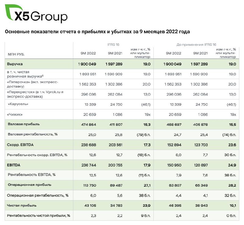 ▫️X5 Group (+1,47%). Компания отчиталась за III кв. и 9 мес. 2022 года по международным стандартам финансовой отчетности (МСФО). Подробные показатели в прилагаемой таблице.