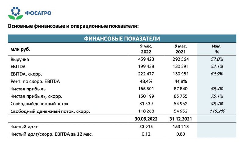 ▫️Фосагро (-0,94%). 3 октября компания отчиталась за 9 мес. 2022 года по МСФО. Общая выручка за 9 мес. выросла на 57% г/г до 459,423 млрд руб. Скорректированная чистая прибыль составила 150,199 млрд руб., увеличившись на 75,1% г/г. Совет директоров рекомендовал выплатить промежуточные дивиденды за 9 мес. в размере 318 руб на акцию, Дата закрытия реестра для получения дивидендов - 19 декабря.