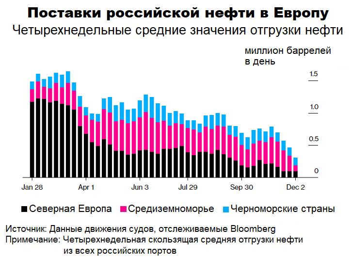 Bloomberg: поставки российской нефти в Европу с января текущего года сократились на 1,5 млн баррелей в сутки.
