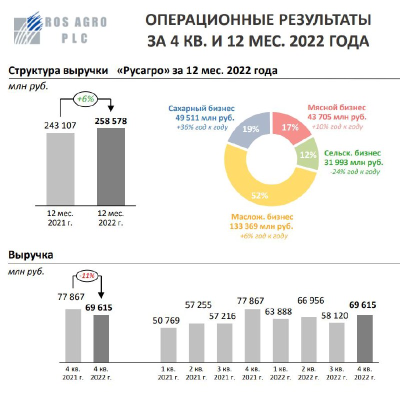 ▫️Русагро (+2,65%). Компания объявила операционные результаты за IV кв. и 2022 год. За 2022 год консолидированная выручка "Русагро" составила 258,578 млрд руб., увеличившись на 6% по сравнению с 2021 годом (243,107 млрд руб.).