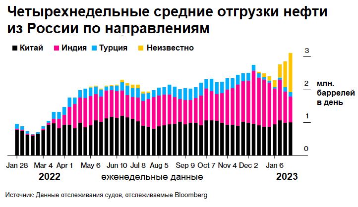 Среднесуточный экспорт российской нефти по морю за последние четыре недели вырос на 125 тыс. баррелей к 3 февраля, до 3,465 млн баррелей. Показатель является самым высоким с июня 2022 года, сообщил Bloomberg.