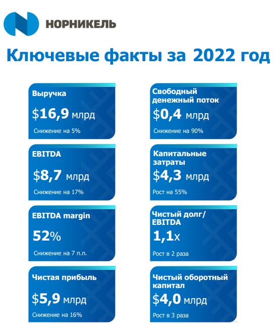 ▫️ГМК НорНикель (-0,62%). Компания опубликовала финансовые результаты 2022 г. по МСФО. Выручка снизилась на 5,5% г/г и составила $16,876 млрд, EBITDA снизилась на 17% г/г и составила $8,697 млрд, чистая прибыль сократилась на 16% г/г и составила $5,854 млрд.