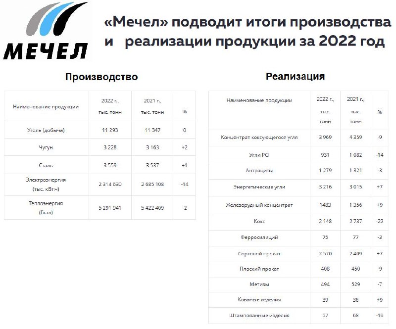 ▫️Мечел об. (-1,84%), Мечел пр. (-1,04%). "Мечел" подвел итоги производства и реализации продукции за 2022 г. Продажи концентрата коксующегося угля (ККУ) снизились на 9% г/г в связи с ограничениями на перевозку продукции по ж/дороге к дальневосточным портам во второй половине 2022 г. Снижение реализации коксовой продукции на 22% обусловлено административными и логистическими барьерами в отношении отгрузок в европейском направлении и сокращением спроса со стороны российских потребителей