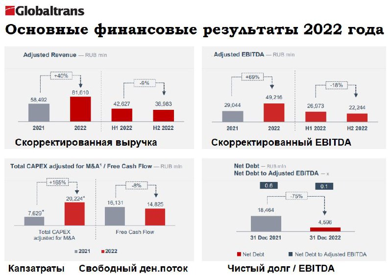 ▫️Globaltrans (-1,18%). Компания опубликовала финансовые и операционные результаты за 2022 г. Выручка выросла до 94,5 млрд руб., а скорректированная выручка (ключевой компонент) увеличилась до 81,6 млрд руб. (+40% г/г). Скорректированный показатель EBITDA увеличился на 69% г/г и составил 49,2 млрд руб. Прибыль за год выросла на 65% г/г до 24,9 млрд руб. Чистый долг на конец года составил 4,6 млрд руб., сократившись по показателю NetDebt/EBITDA с 0,6 (на конец 2021 г.) до 0,1. Но выплаты дивидендов остаются приостановленными в связи с техническими сложностями с направлением средств холдинговой компании, зарегистрированной на Кипре.