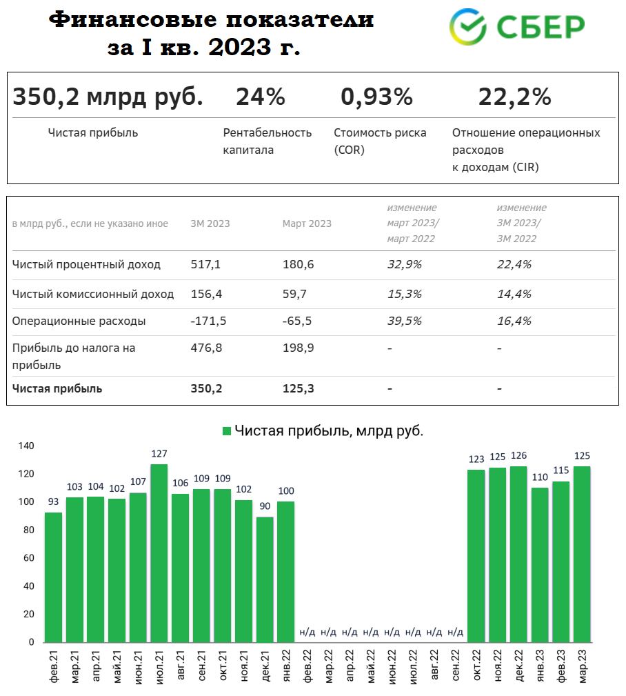 ▫️Сбербанк об. (-1,47%), Сбербанк пр. (-1,28%). "Сбербанк" опубликовал финансовые результаты за I кв. 2023 г. по российским стандартам отчетности: чистая прибыль составила 350,2 млрд руб. (в марте – 125,3 млрд руб.), чистые процентные доходы составили 517,1 млрд руб. (в марте – 180,6 млрд руб.), чистые комиссионные доходы составили 156,4 млрд руб. (в марте – 59,7 млрд руб.). В марте "Сбербанк" выдал максимальный за всю историю объем розничных кредитов – более 660 млрд руб.