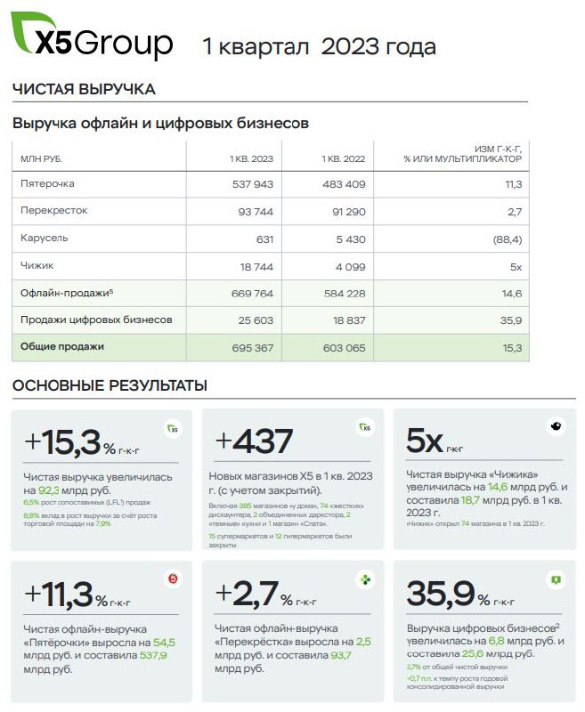 ▫️X5 Group (+4,47%). X5 Group опубликовала операционный отчет за I кв. 2023 г. Чистая выручка увеличилась на 15,3% г/г и составила 695,367 млрд руб. 77,36% выручки пришлось на магазины "Пятерочка" (537,943 млрд руб.). Количество магазинов за I кв. увеличилось на 437 шт. Сопоставимые продажи (LFL) выросли на +6,5% г/г. X5 Group приобретает 295 магазинов ООО "Тамерлан", которое управляет сетью магазинов в Южном федеральном округе и Ставропольском крае. Общая торговая площадь приобретаемых магазинов составляет 124,2 тысяч кв. м.