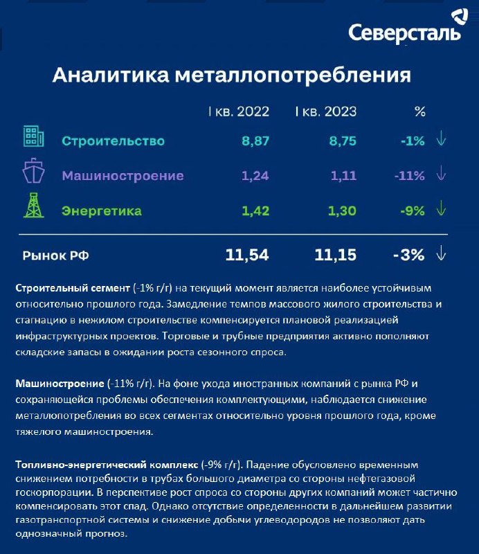 ▫️Северсталь (+1,3%). "Северсталь" подвела итоги рынка металлопотребления в РФ в I кв. 2023 г. Емкость рынка металлопроката в РФ в I кв. снизилась на 3% относительно I кв. прошлого года, но продемонстрировала рост на 6% относительно уровня IV кв. 2022 г.