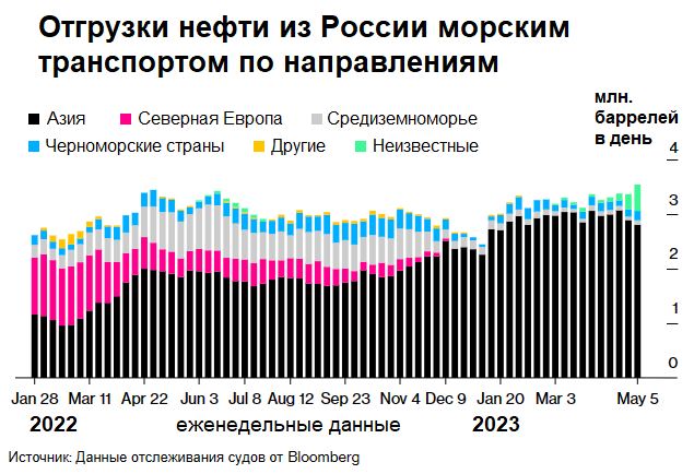 ▫️Агентство Bloomberg продолжает фиксировать рост морских отгрузок российской нефти – за 4 недели объем нефти, перевозимой по морю, составил почти 4 млн баррелей в сутки. Относительно первой недели апреля показатели увеличились на 15%. Относительно итогов 2022 г. отгрузка нефти из российских портов стала выше на 1,2 млн баррелей в сутки.