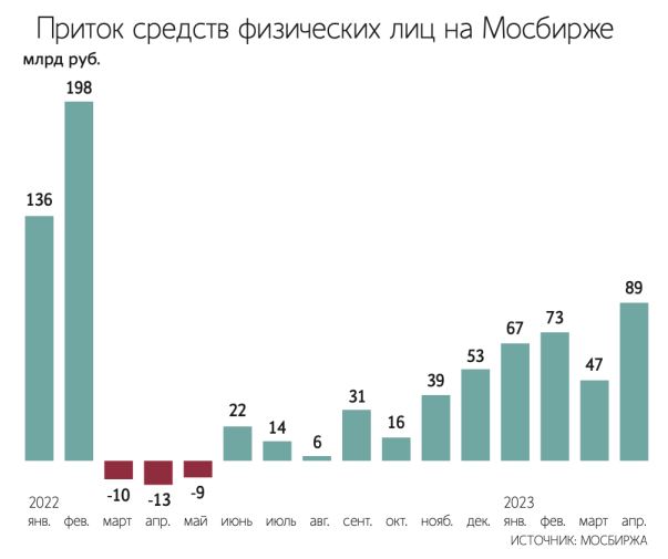 ▫️Мосбиржа (-0,19%). 🟢 В апреле чистый приток средств частных инвесторов в активы на Московской бирже достиг максимума с февраля 2022 г. Объем покупок превысил объем продаж на 89 млрд руб. В феврале 2022 г. этот показатель был на уровне 198 млрд руб. С октября 2022 г. чистый приток рос почти каждый месяц. Исключением стал лишь март 2023 г., когда показатель упал на 35,62% по сравнению с предыдущим месяцем и составил 47 млрд руб.