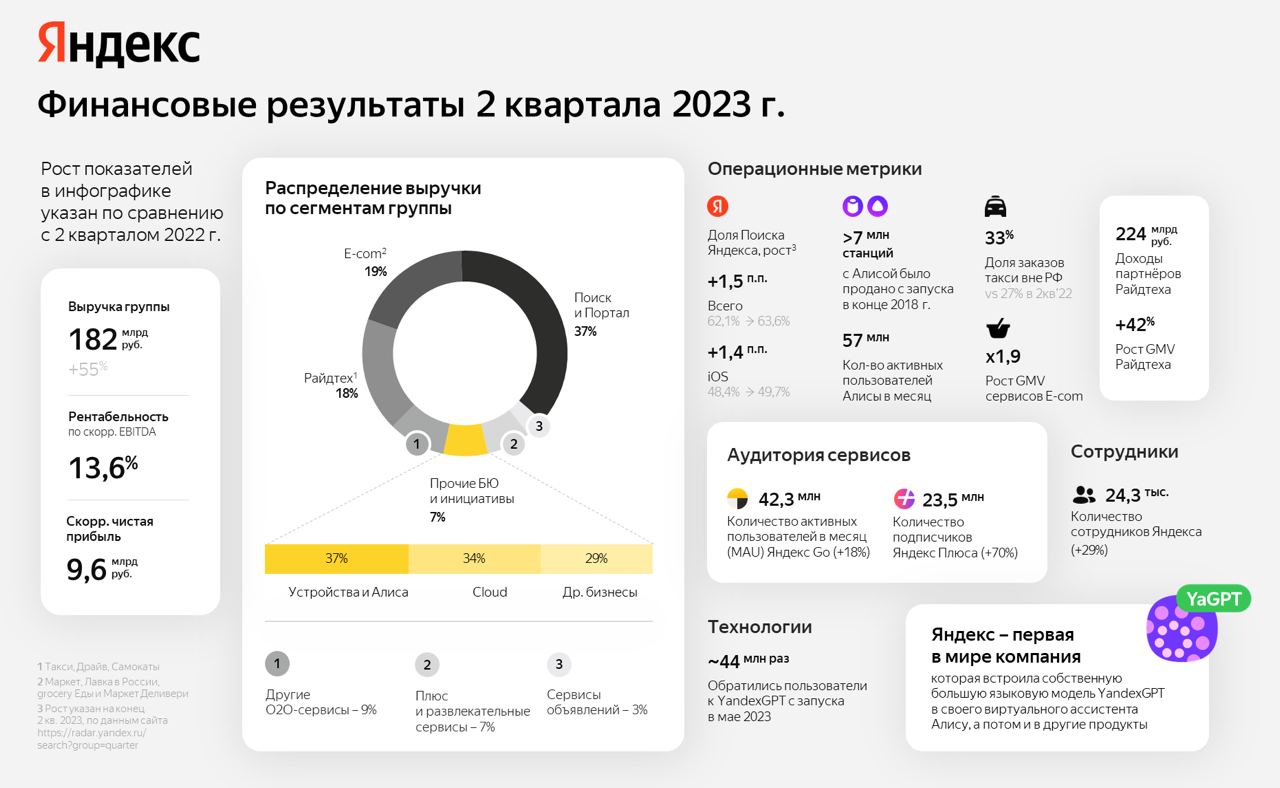 ▫️Яндекс (-0,63%). 🟡 "Яндекс" отчитался за II кв. 2023 г. Выручка увеличилась на 55% г/г до 183,495 млрд руб. Скорректированный показатель EBITDA снизился на 4% г/г до 24,746 млрд руб. Рентабельность по скорректированной EBITDA составила 13,6%. Скорректированная чистая прибыль за квартал снизилась на 27% г/г до 9,646 млрд руб.