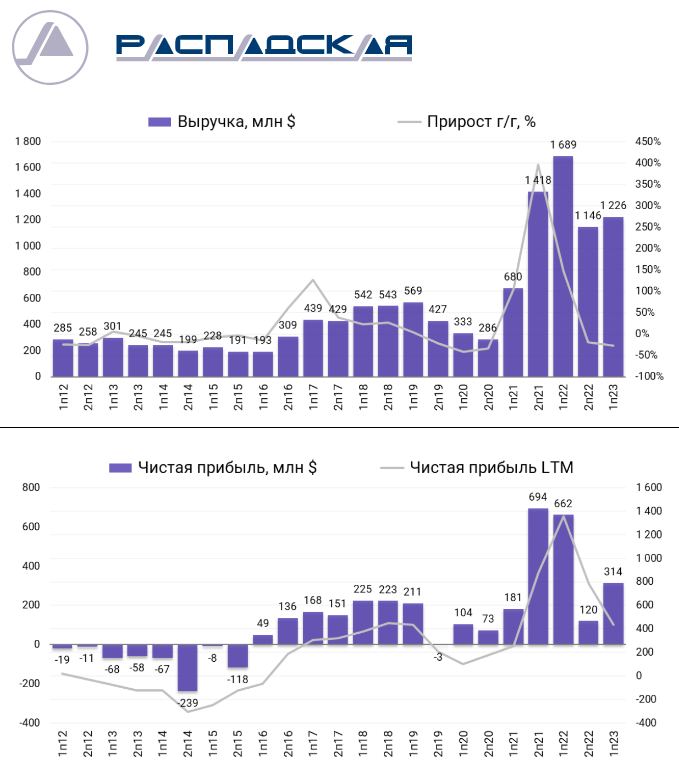 ▫️Распадская (-1,27%). 🔴 "Распадская" опубликовала финансовые результаты по МСФО за I полугодие 2023 г. Выручка снизилась на 27% г/г до $1,226 млрд. Показатель EBITDA снизился на 59% г/г до $432 млн, чистая прибыль снизилась на 53% г/г до $314 млн. Совет директоров рекомендовал не выплачивать дивиденды по результатам I полугодия 2023 г. Объем добычи рядового угля всех марок составил 8,9 млн тонн по сравнению с 10,1 млн тонн в I полугодии 2022 г. По состоянию на 30 июня 2023 г. денежные средства и их эквиваленты достигли $330 млн. Чистый долг на уровне $307 млн.