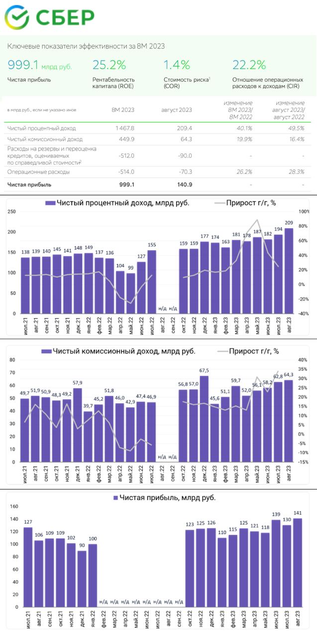 ▫️Сбербанк об. (+0,23%), Сбербанк пр. (0%). 🟢 "Сбербанк" раскрыл сокращенные финансовые показатели по РСБУ за август. С начала года кредитный портфель "Сбербанка" вырос на 17,8% до 36,3 трлн руб., средства физических лиц приросли на 12,7% до 20,661 трлн руб., средства юрлиц увеличились на 18% до 10,3 трлн руб. За 8 месяцев чистые процентные доходы составили 1,4678 трлн руб. (+40,1% г/г), чистые комиссионные доходы - 449,9 млрд руб. (+19,9% г/г). Чистая прибыль за 8 мес. составила 999,1 млрд руб. (прибыль за август 140,9 млрд руб.) при рентабельности капитала в 25,2%. "Сбербанк" в августе выдал рекордный объем ипотеки - 522,5 млрд руб. Всего за 8 месяцев 2023 г. банк выдал более 819 тысяч жилищных кредитов на 2,7 трлн руб. (в объемах выдач это почти на 6% больше, чем за весь прошлый год).