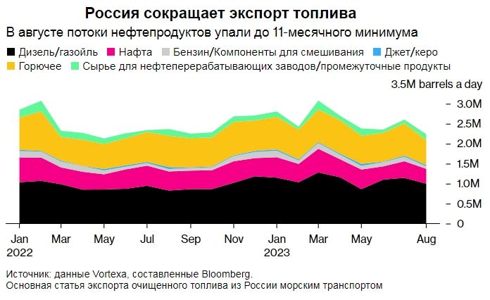 Bloomberg: Экспорт нефтепродуктов из России в августе упал до 11-месячного минимума. - экспорт в августе составил 2,28 млн баррелей в день. Это на 9% меньше, чем в июле, и является самым низким показателем с сентября 2022 г. Это произошло на фоне сокращения переработки нефти, поскольку НПЗ свернули работу на плановое осеннее техническое обслуживание.