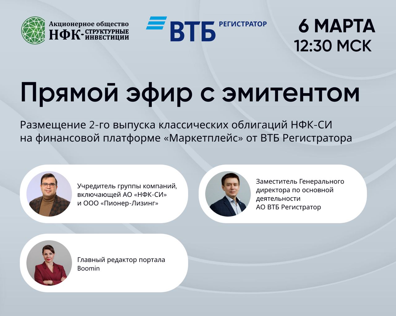 Прямой эфир с учредителем группы компаний, включающей АО «НФК – Структурные инвестиции» (НФК-СИ), ООО «Пионер-Лизинг» и АО «НФК-Сбережения», Евгением Наумовым состоится 6 марта в 12:30 по московскому времени на YouTube-канале Boomin. В мероприятии также примет участие заместитель генерального директора по основной деятельности АО ВТБ Регистратор Максим Гецьман.