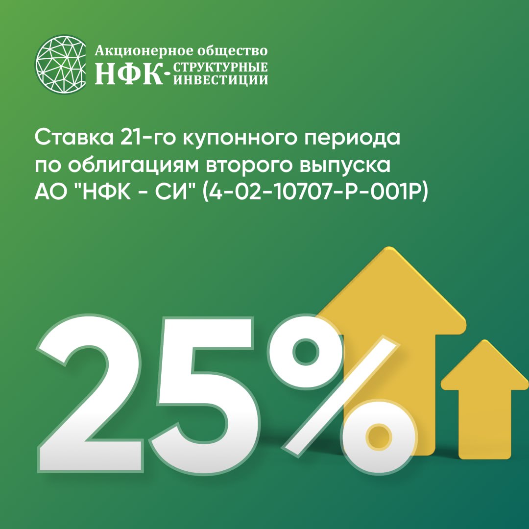 23 сентября 2024 г. АО «НФК-СИ» установило ставку 21-го купонного периода по облигациям второго выпуска (4-02-10707-P-001P) в размере 25% годовых, выплата на одну облигацию составит 20,55 руб. Дата начала купонного периода – 23 сентября 2025 г., дата выплаты купона – 23 октября 2025 г.