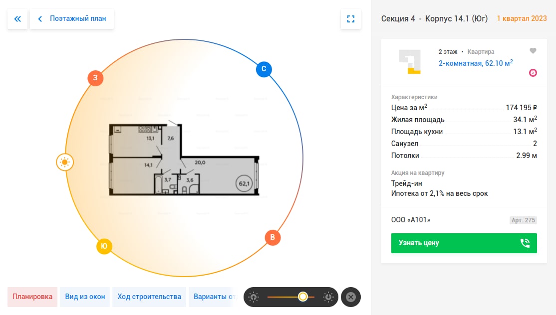 Посмотрите, какие планировки предлагает застройщик в этом ЖК и оцените их инсоляцию и виды из окон – на поэтажных планах.