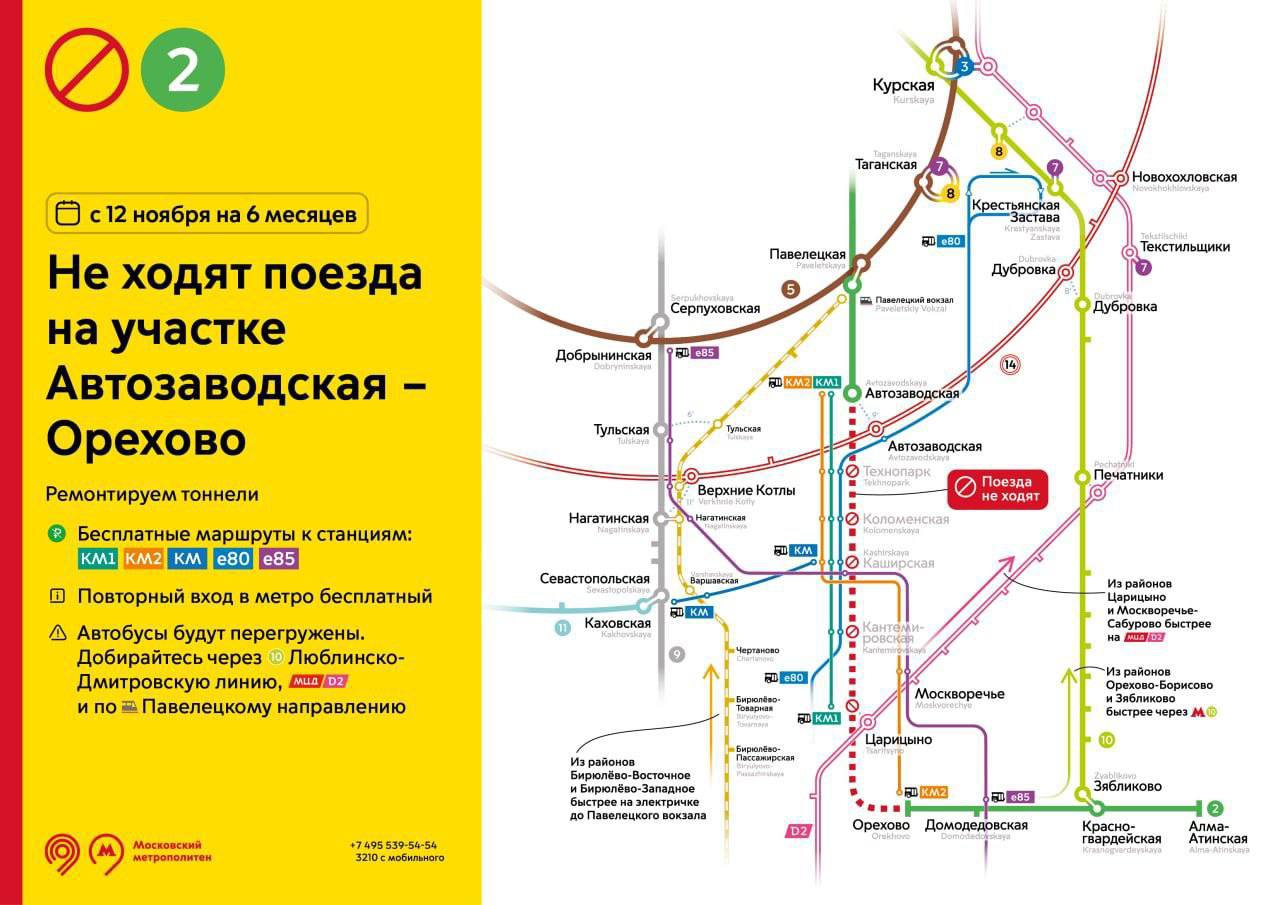 С 12 ноября будет закрыт участок Замоскворецкой линии метро от «Автозаводской» до «Орехово»
