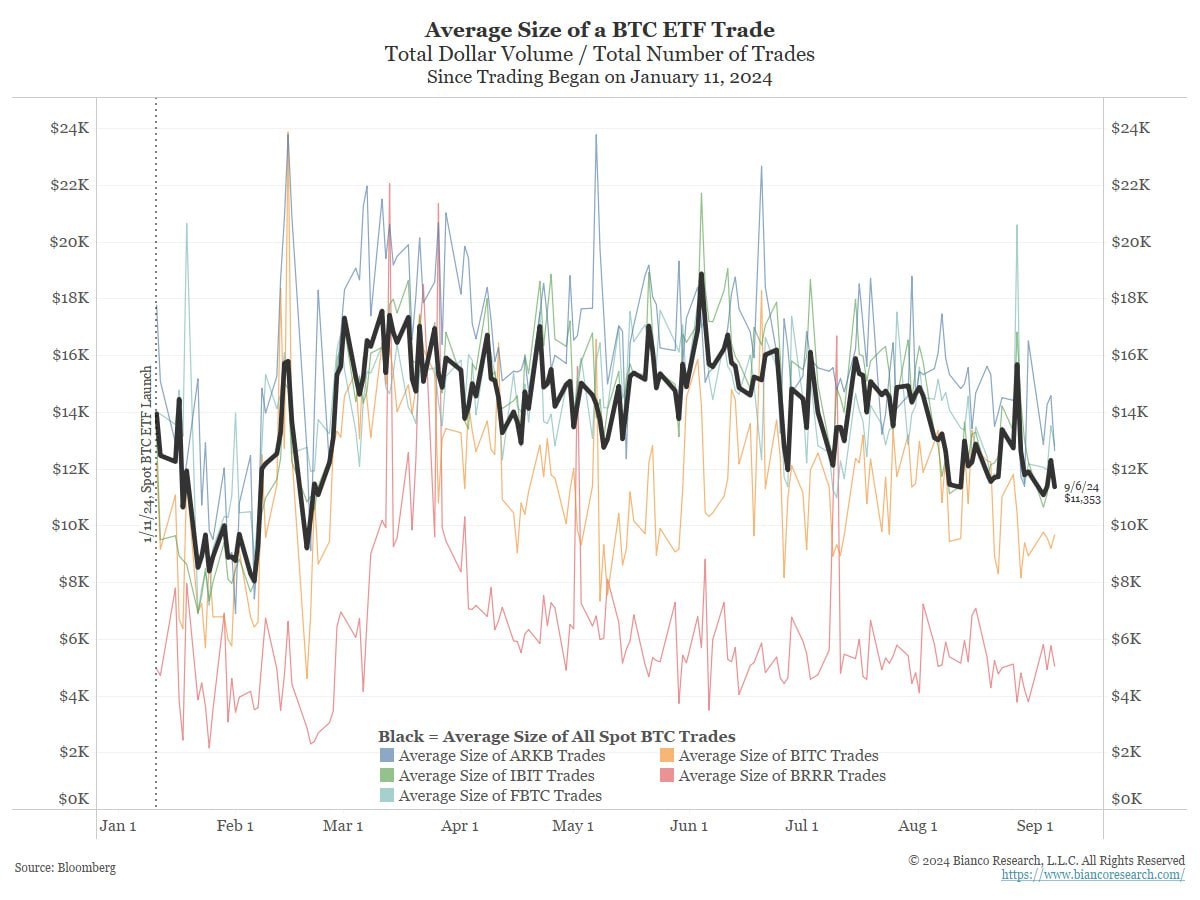 Еще интереснее то, что средний размер сделок на спотовых ETF находится в достаточно скромном диапазоне от $11 000 до $16 000, а участвующие в них трейдеры терпят убытки.