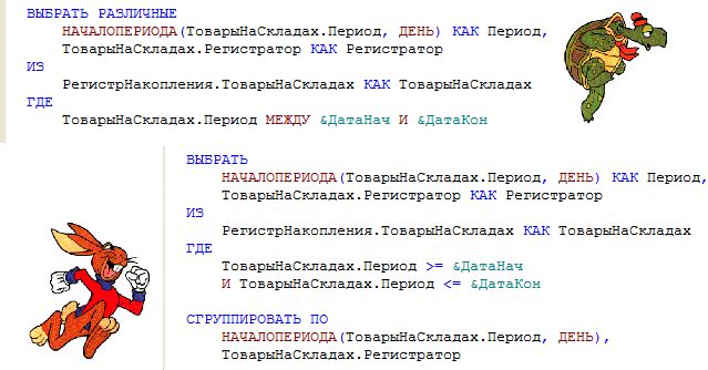 А вот прямая проверка Периода регистров выигрывает по сравнению с условием МЕЖДУ в подавляющем большинстве случаев. По крайней мере, ни разу не наблюдал, чтобы делала хуже. Зато случаи, когда условие МЕЖДУ изрядно подвешивает запрос, бывали.