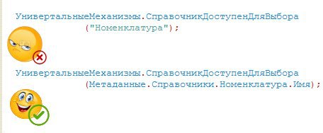 Если вы реализуете универсальные функции, которые принимают в качестве параметра имя метаданного, то при её вызове используйте вместо строки свойство "имя" элемента коллекции метаданных. Это обезопасит ваш код в случае изменения имени объекта конфигурации - ошибка будет обнаружена уже на этапе синтаксического контроля.