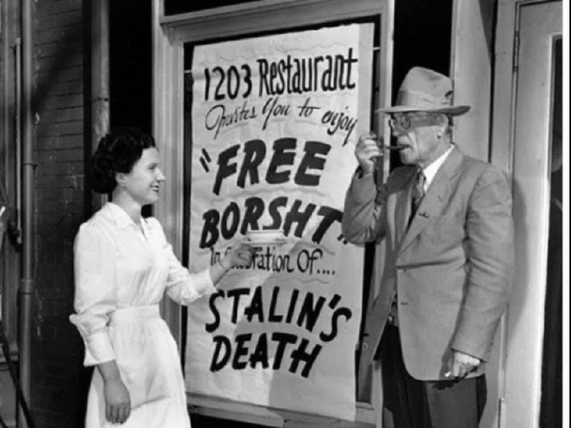 (На фото - «Всем бесплатный борщ! Сталин - мертв!»)