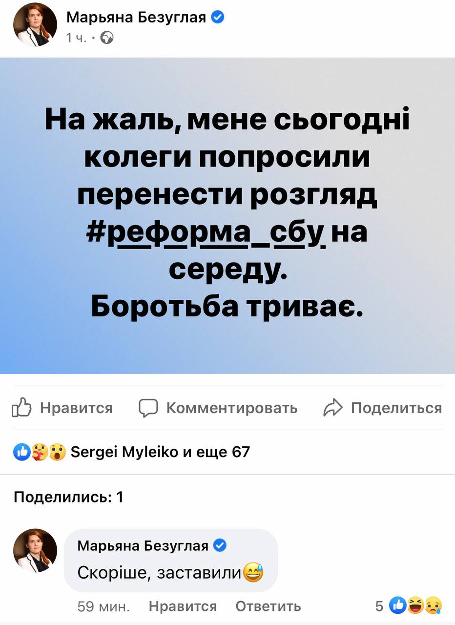 ⚡️«Тетя» з МЕДИЧНОЮ освітою (депутат від «Слуги народу» Мар'яна Безугла), яка ні секунди не працювала в #СБУ і займається реформуванням СБУ, відкрито у FB зізнається, що її «попросили», і вона відклала розгляд законопроекту про реформу СБУ.