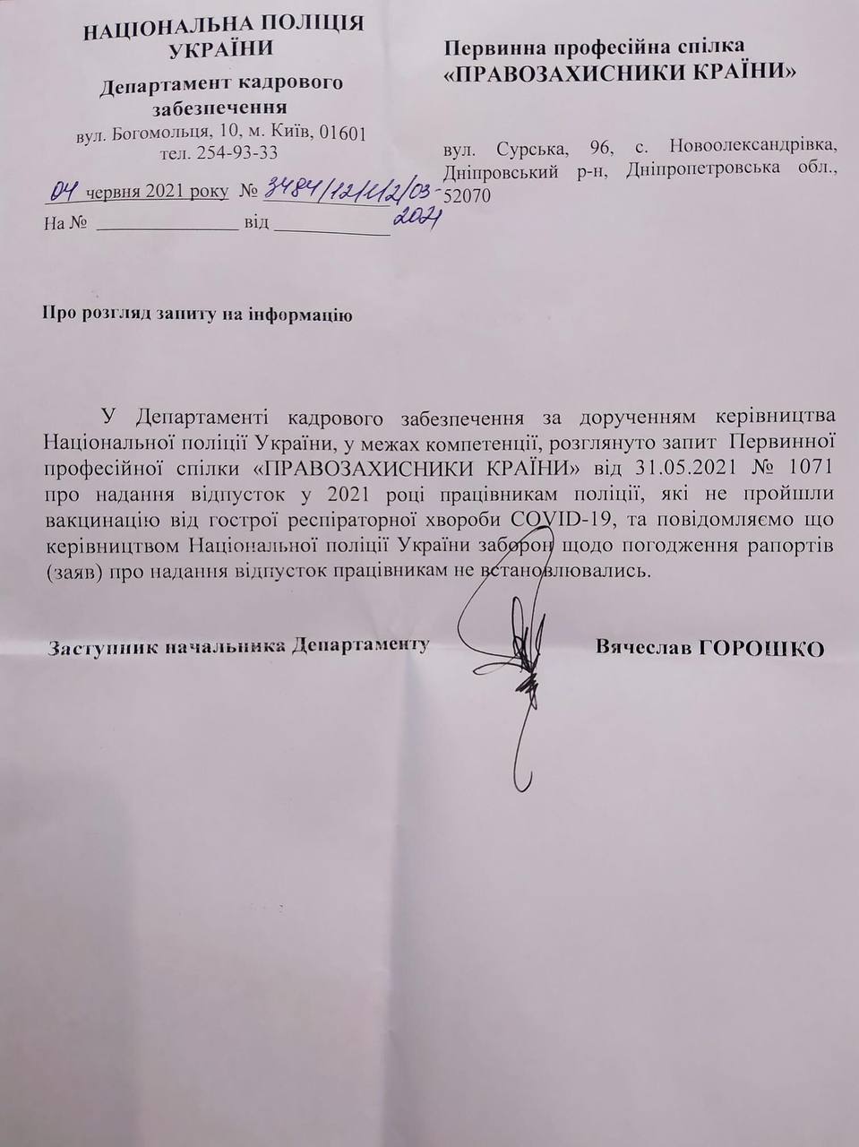 Департамент кадрового забезпечення Національної поліції України повідомив, що керівництвом Нацполіції не встановлювалися заборони щодо погодження рапортів (заяв) про надання відпусток працівникам які не пройшли вакцинацію від гострої респіраторної хвороби COVID-19.