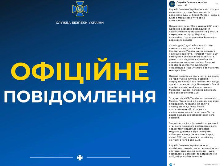 ⚡️ В #СБУ заявили, що не «викрадали» екссуддю Чауса та діяли в межах закону та своїх повноважень.