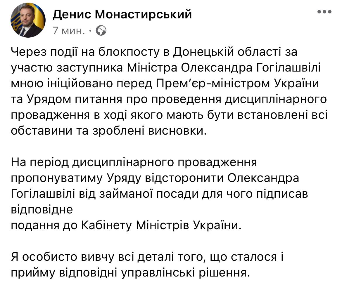 «Через події на блокпосту в Донецькій області за участю заступника Міністра Олександра Гогілашвілі мною ініційовано перед Прем’єр-міністром України та Урядом питання про проведення дисциплінарного провадження в ході якого мають бути встановлені всі обставини та зроблені висновки.