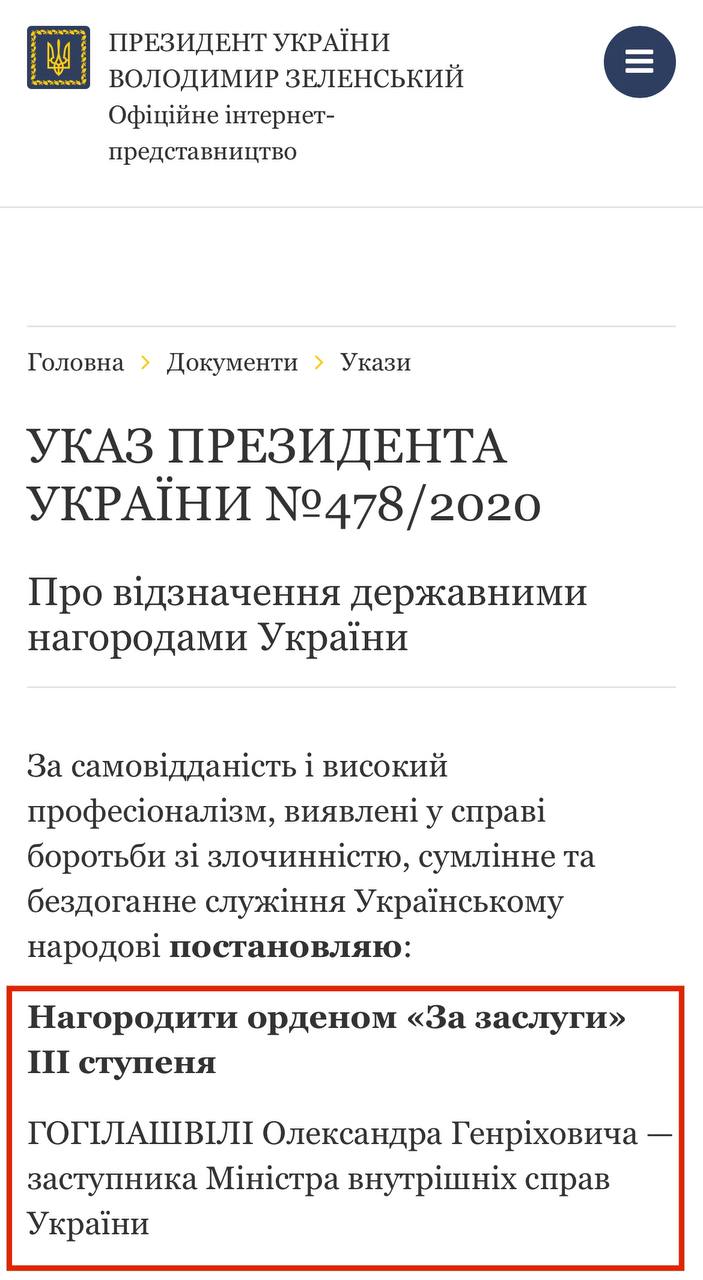 та нагородив орденом «За заслуги» III ступеня ГОГІЛАШВІЛІ Олександра Генріховича — заступника Міністра внутрішніх справ України.